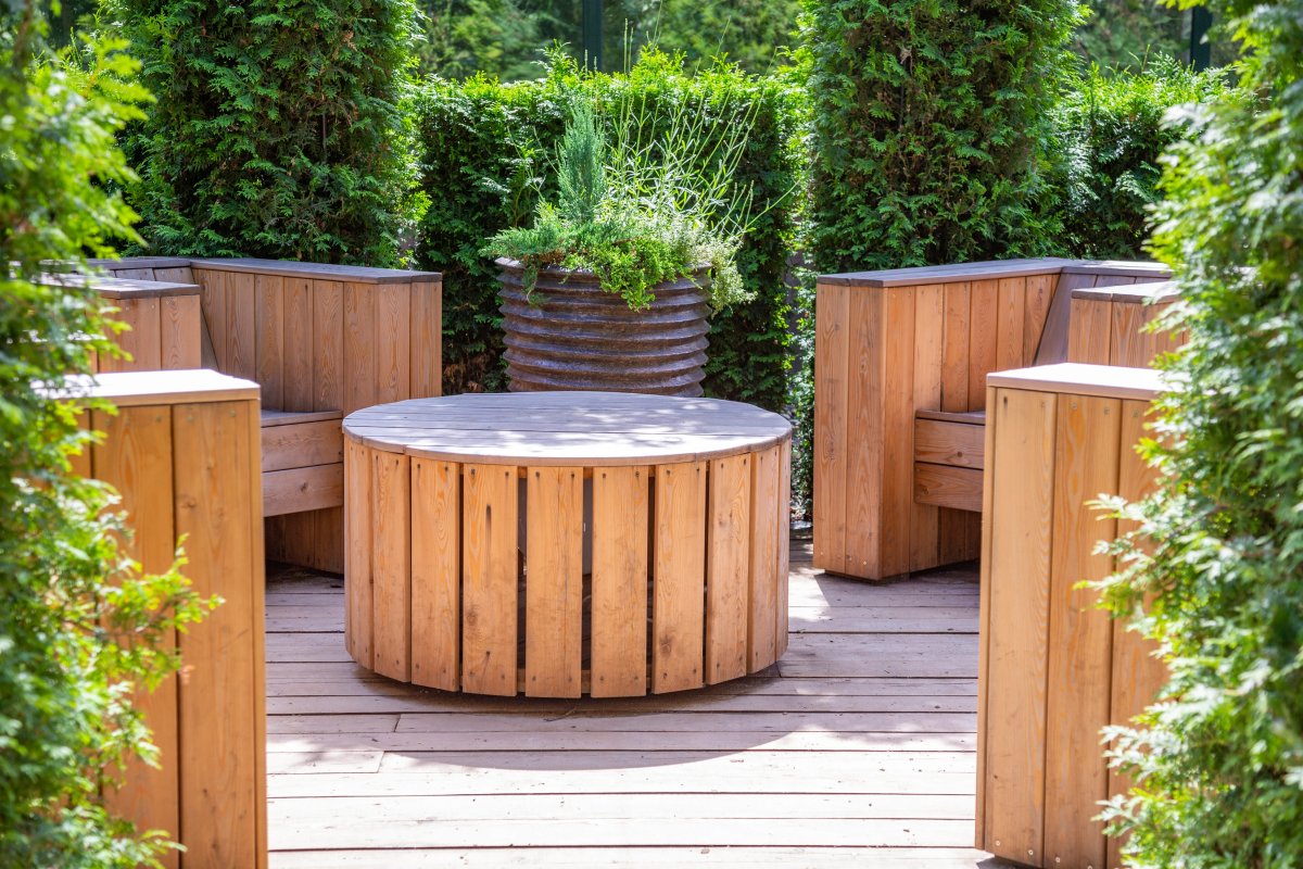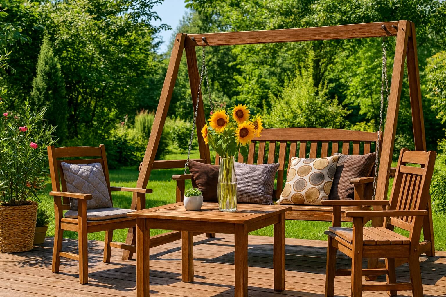 - Zahradní nábytek – lavičky, stoly, židle a sety z odolných dřevin pro celoroční použití